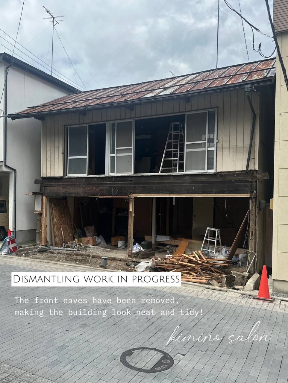 駐車場にするべく、正面の下屋部分を解体しております。