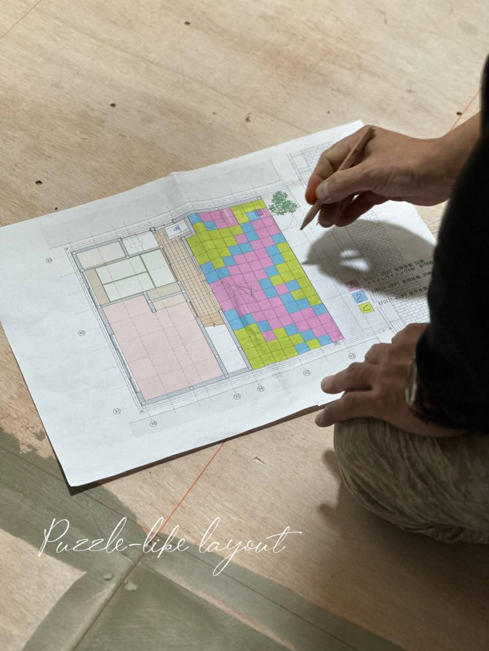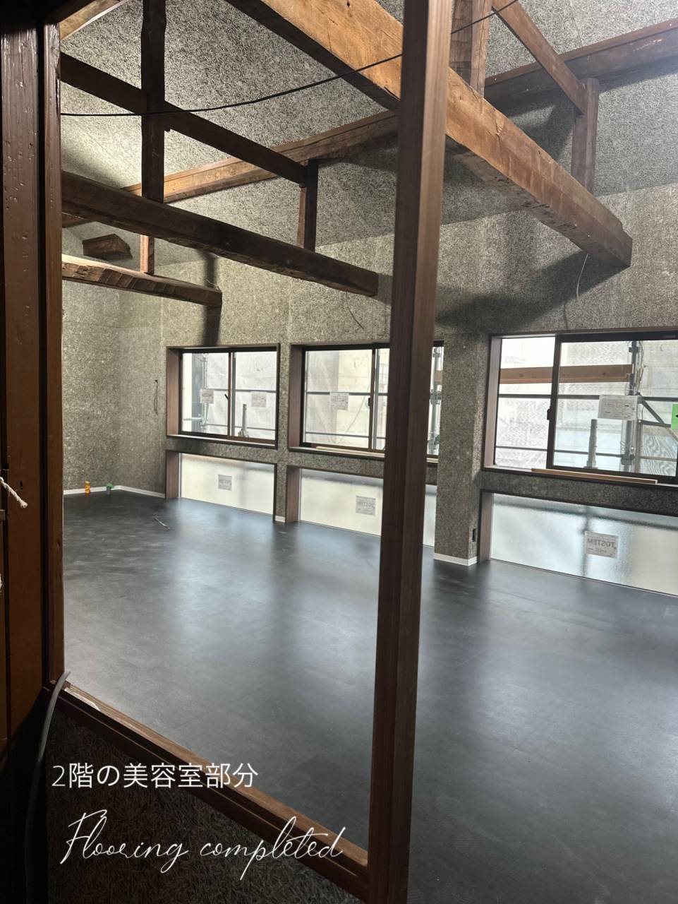 福島で店舗改装ならlean(リアン) 2025/10/16 本日は美容室の現場へ💇 1階の壁にはクロスが張られ、ちょうど床材の割り付け作業中でした! 割り付けはまさにパズル🧩 A、B、Cと割り振り間違えないように印をつけます。 さすがデザイナーさん!アートです! 仕上がりが楽しみです♪ 二階は床は張り終わり、シックなブラックに! いよいよ完成が近づいて来ましたね♪ 栗城 Owner: @konno.konnosayaka Design: @tordimo_spacedesign_office