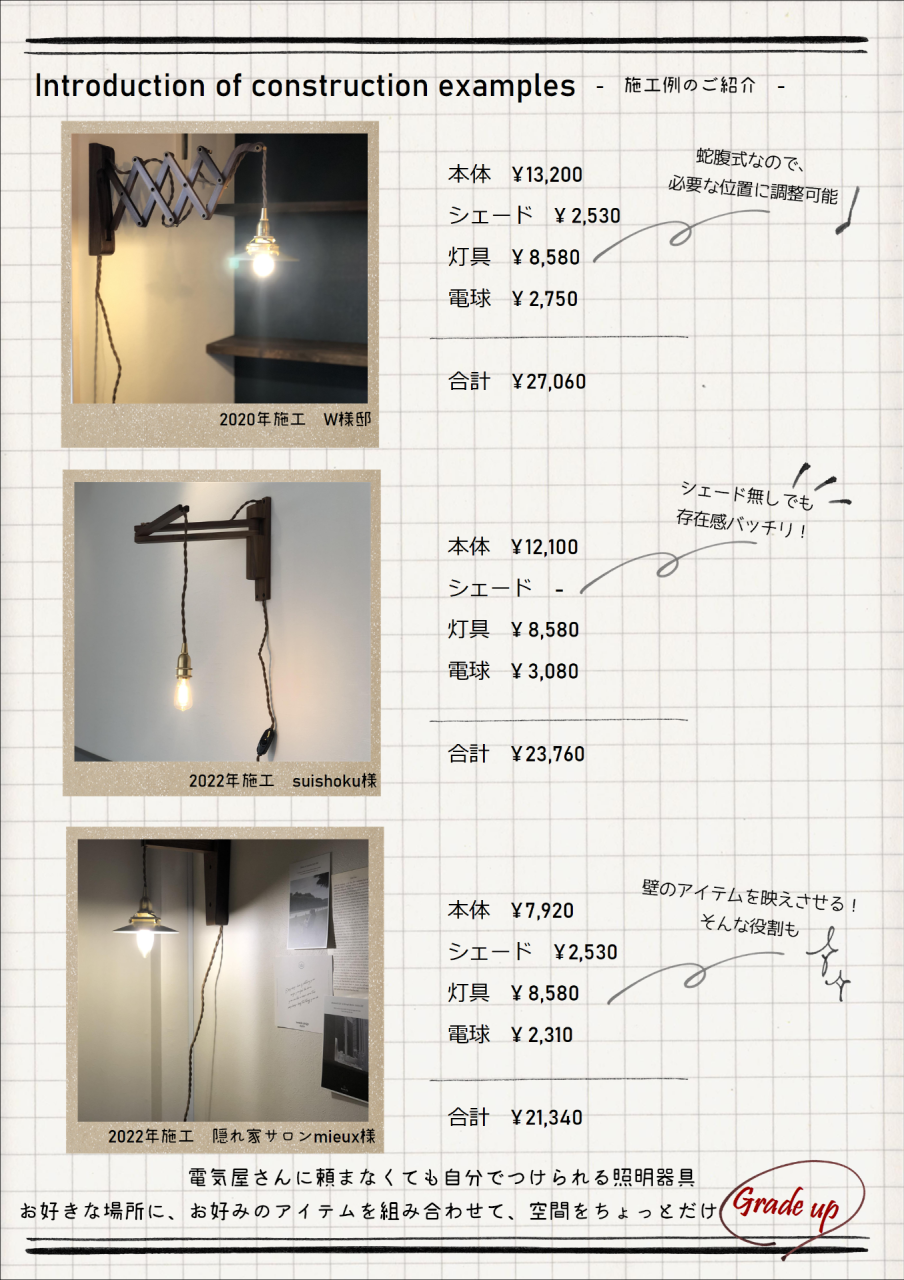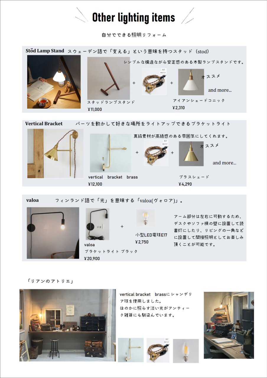 福島でリフォームならlean(リアン)へ 2025/12/19 お店に立っていると、リフォームしたいな〜というお声をいただきますが、ほとんどの方が、 お金かかるんでしょ? 大ごとになる? と思っているようでした! でも、リフォームにも色々ありますが、簡単にできるリフォームの一つに 「照明器具を変える」 という方法があります! なんだか大変そう…と思われるかもしれませんが、 ご紹介するこちらの商品、 "スイッチ付きのコード式ブラケット照明" コンセントに挿すだけで使えちゃうんです🔌 そう!電気屋さんに頼まずとも、自分でできちゃうんです! バリエーションも豊富♡ 数年前は木製のタイプしかなかったのですが、アイアンや真鍮のタイプも増えたんです♪ そしてそちらの応用編の"スタンド照明"も! ちょっと壁が寂しい… 読書する時にちょっと手元が暗い… アート作品を照らしたい… そんなお悩みはこちらをつけるだけで解決🫡 照明って、空間にどう持っていくかで見え方が変わります。設置する位置、高さでも変わります。 印影がより空間の魅力をアップさせたり、暖かみを演出したり、照明を楽しむとお部屋作りが楽しくなりますよ♪ アトリエのリフォームコーナーでは実際に照明を見ていただけます! ペンダント照明を変えるのも、リフォームの一つ! 組み合わせ方、照明の選び方で困ったら、ぜひご相談下さい♪ さらにクロス、タイルの選び方など、内装や、外装のご相談もお受けしております💁 今週日曜日、「リアンのアトリエ」でお待ちしております♪ プランナー栗城