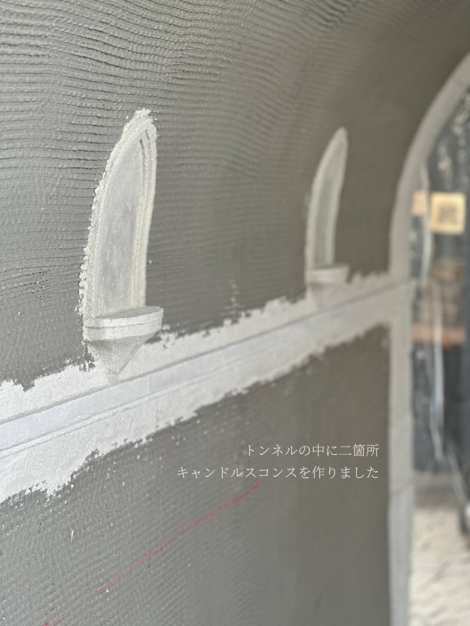 福島市でモルタル造形ならlean(リアン) 2026/03/02 アトリエのトンネル 壁にちょっとしたアクセント💁 トンネル内の雰囲気を出すために、あえてキャンドルで光を灯したいと思っていました。 その為のキャンドルスコンス(壁燭台) オーダーしたのは下の"受け"の部分だけでしたが、社長がアレンジしてくれました! 途中はトイレみたいな感じだと思って見ていましたが。笑 仕上がりはめちゃくちゃかわいい♡ 周りの壁はこれから仕上げます! イメージは壁を切り崩して作ったキャンドルスコンスなので、ちょっと埋もれた感じにしたいと思います♪ いい感じのキャンドル探さないと〜🕯️🤭 空間ができてくると、雑貨をディスプレイしたくなります♪ プランナー栗城